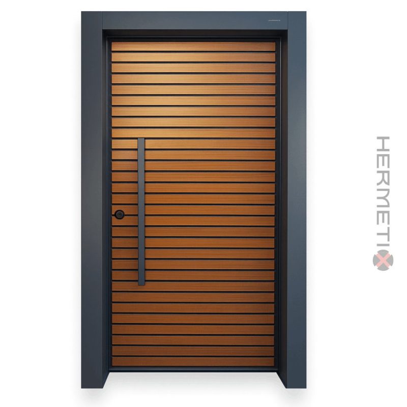 דלת חוץ עם חיפוי סרגלי אלומיניום בגוון דמוי עץ. ידית משיכה ופירזול בצבע בתנור תואם למשקוף.